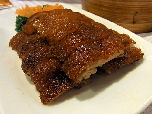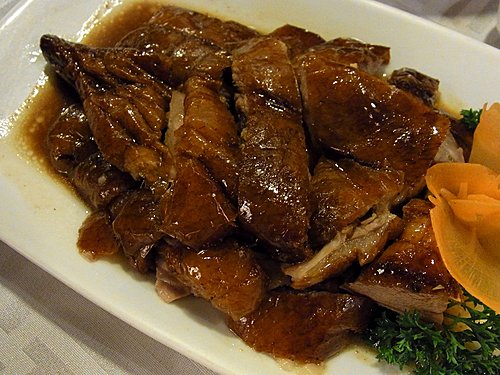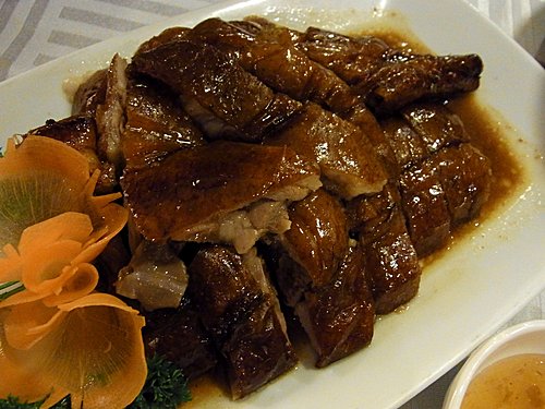 明 爐 脆 皮 黑 毛 鵝 ($68/例) 係 招 牌 菜 之 一 ,落 單 時 已 沽 清 ,店 方 話 即 燒 要 多 等 45 分 鐘 ,我 一 聽 到 即 燒 ,即 刻 話 no . . . problem ,照 等。反 正 自 己 都 未 聽 過 黑 毛 鵝 ,兼 且 部 長 強 調 此 鵝 比 平 時 食 開 嘅 脆 皮 燒 鵝 皮 更 脆 、肉 更 嫩 . . . (下 删 數 十 字) ,而 家 仲 要 即 燒 ,眾 人 自 然 滿 心 期 待。