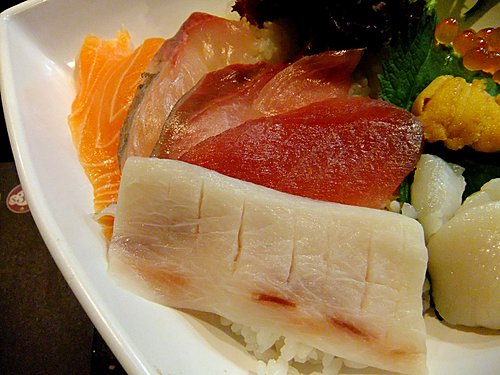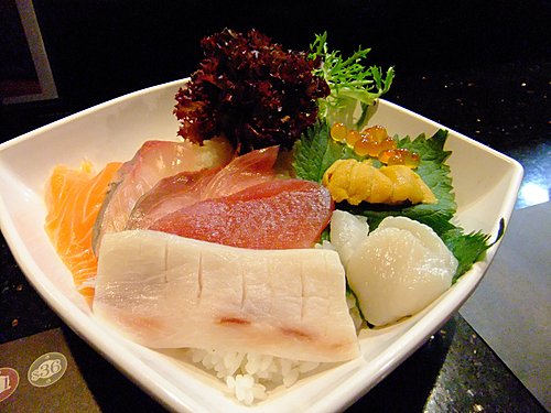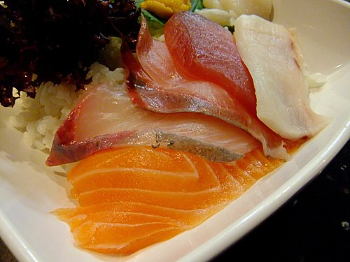 金 水 刺 身 飯 嘅 6 款 刺 身 包 括 吞 拿 魚 、三 文 魚 、油 甘 魚 、劍 魚 腩 、帆 立 貝 及 海 膽。成 碗 飯 好 似 喺 5 日 前 無 包 保 鮮 紙 就 咁 放 入 雪 櫃 ,而 家 攞 番 出 嚟 咁 ,仲 dry 過 Sammi!