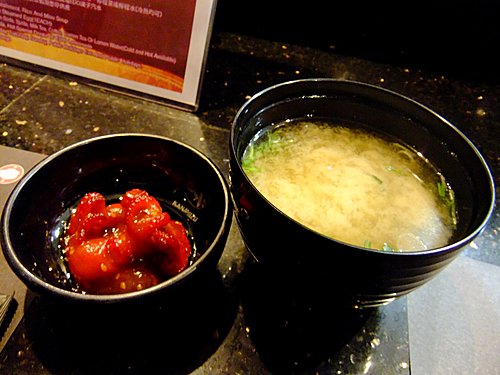 金 水 刺 身 飯 套 餐 ($88) 跟 前 菜 、白 飯 及 麵 豉 湯 ,再 貪 平 加 $6 配 一 客 日 式 蒸 蛋 ,以 為 係 招 牌 作 一 定 穩 陣 實 無 死?哈 哈!先 嚟 碗 好 鹹 又 唔 熱 嘅 所 謂 麵 豉 湯。