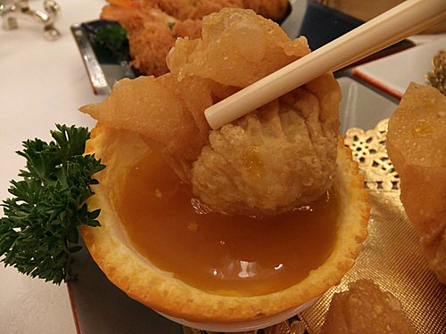 雲 吞 炸 得 香 脆 ,蝦 肉 夠 鮮 味 ,蘸 埋 橙 汁 就 更 好 味。