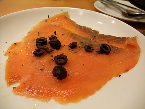 挪 威 煙 三 文 魚 一 碟 有 4 大 片 ,配 上 幾 粒 黑 橄 欖 ,難 得 味 道 唔 錯 ,食 到 魚 味 . . . $25 咁 抵?唔 信 咪 嚟 試 吓 囉 !