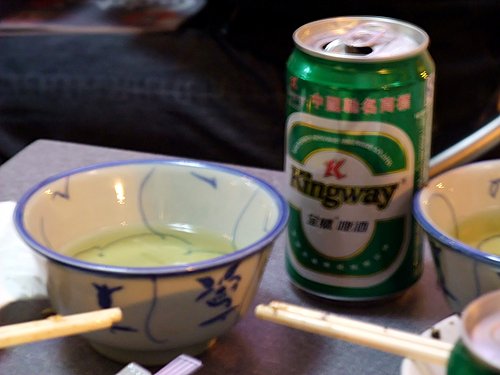 飲 啤 酒 就 用 碗 裝 ,幾 形 呀 呵!我 無 飲 ,張 相 影 人 哋 咋