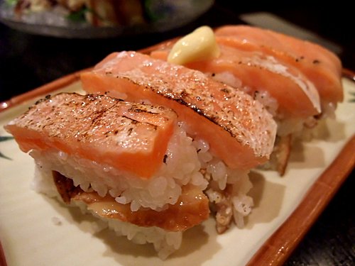 火 焰 板 壓 壽 司 用 肥 美 嘅 三 文 魚 去 做 板 壓 壽 司 ,燒 完 表 層 後 放 上 牛 油 再 喺 你 面 前 點 火 ,呢 $25 抵 俾 啦