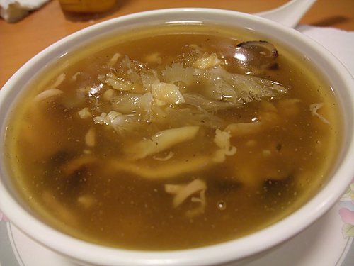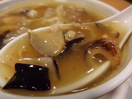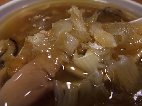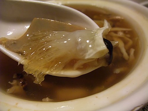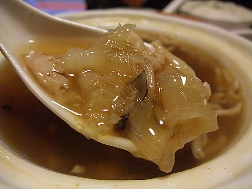 ,但 話 明 真 材 實 料 嘛!個 翅 係 用 梳 仔 脊 翅 ,連 埋 花 膠 、海 參、鮑 魚 絲 同 雞 絲 一 大 堆 配 料 嚟 泡 製 ,而 鮑 魚 亦 係 用 堅 嘢 ,絕 對 值 得 一 試