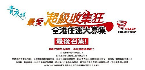 喺 截 止 最 後 一 天 ,王 子 滾 水 淥 腳 咁 參 加 咗 青 衣 城 同 Milk 合 辦 嘅 最 愛 超 級 收 集 狂 狂 迷 大 募 集 . . . http://www.maritimesquare.com/chi/promo.asp#1 王 子 竟 然 入 選 了,展 覽 期 係 今 個 星 期 六 開 始 ( 19/8... 看全文 -