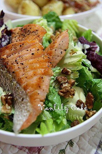 今日係同陳生的10週年拍拖紀念日~ 日子過得真快, 轉眼又十個年頭!! 我煮左大餐俾老公食, 佢好滿意呢~ 煎三文魚Caesa salad 三文魚加黑椒和海鹽輕輕煎煎 沙律醬是跟rachel yau的party food食譜書做的, 用了酸忌廉, 芥末醬, 白醋, 青檸汁等做成~ 仲加左合桃~ 香草烤新薯伴忌廉汁 都是出自party food. 用煙肉炒香再加已煲腍的新薯, 仲有牛油, rosemary... 看全文 -