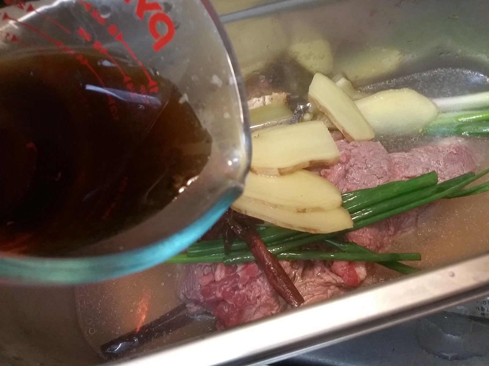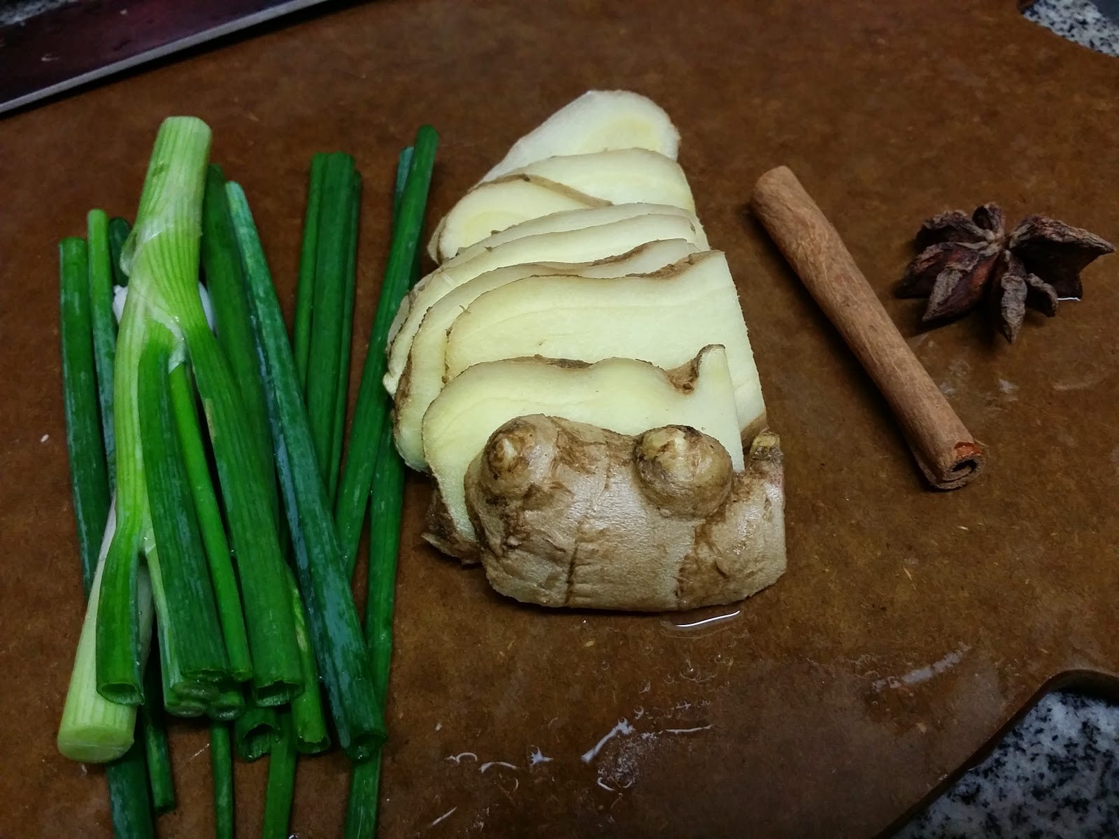 加入牛肉湯材料內的薑片、蔥及肇興酒