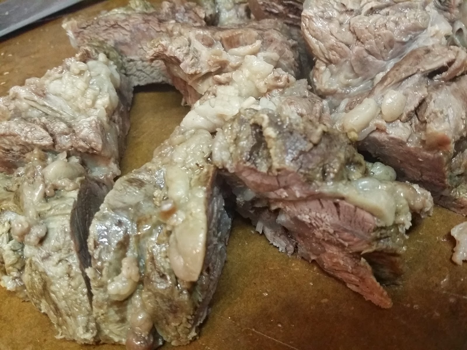 5. 燉好的牛腩拿出來切件 (麻雀大小)