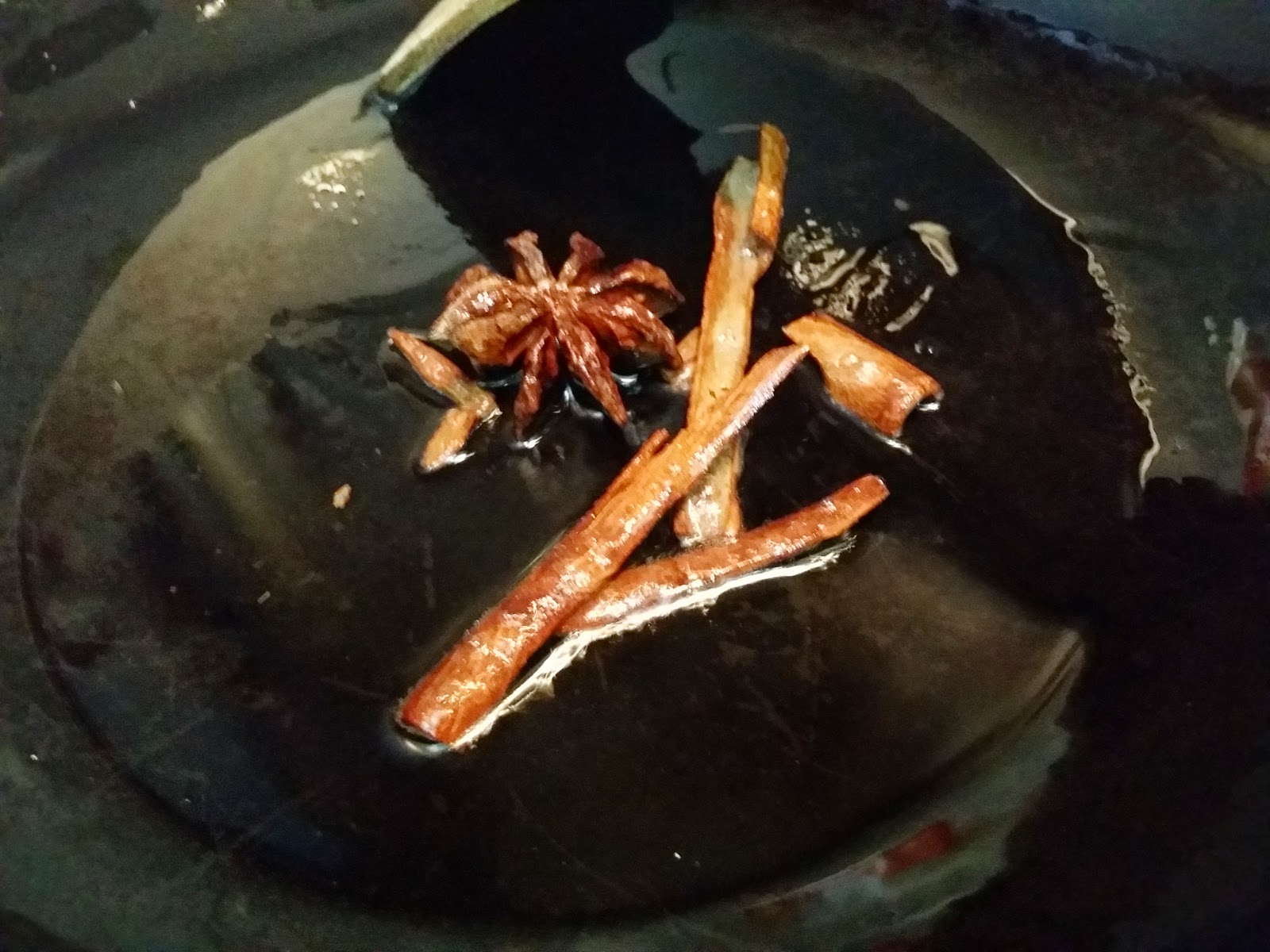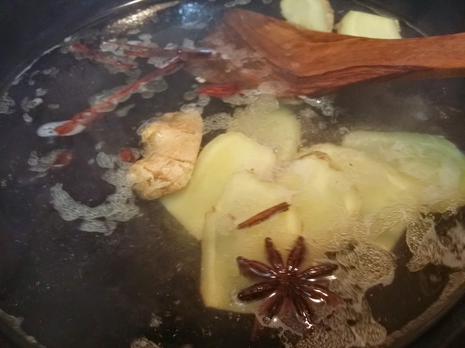 2. 燒熱鍋加1湯匙油, 爆香桂皮及八角加入1L 水