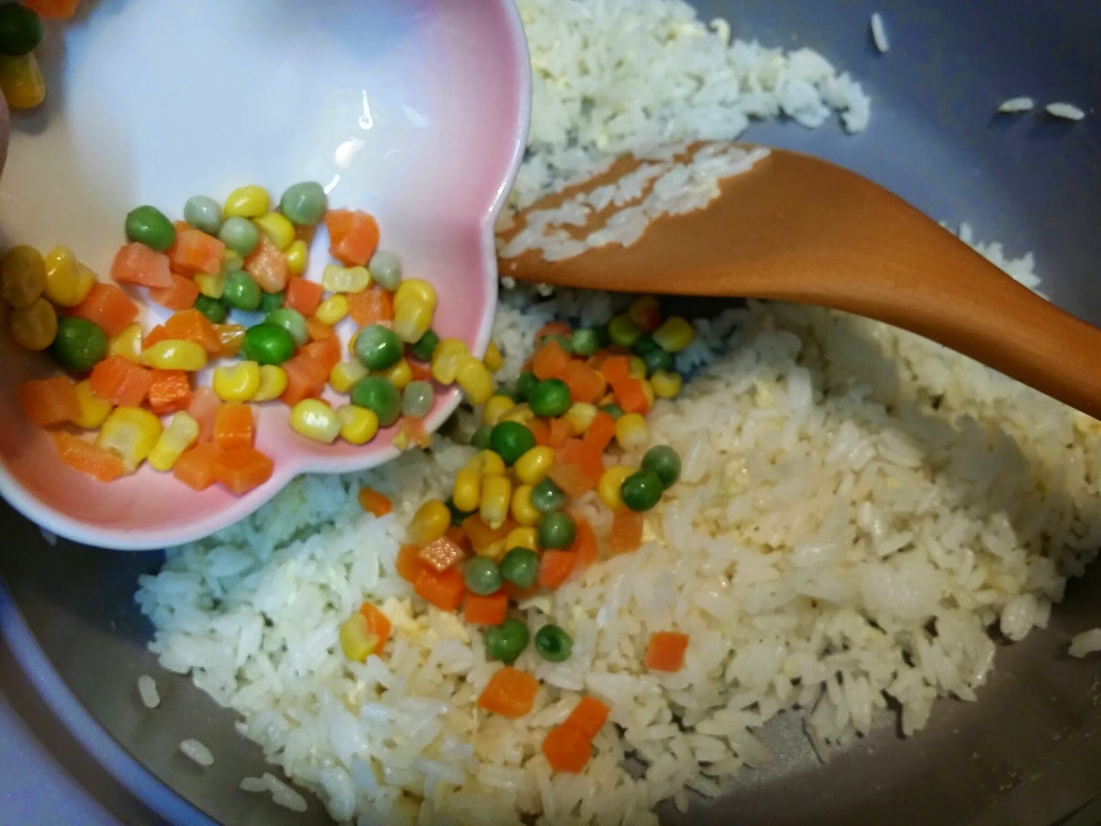 炒飯~加油燒熱鑊,下飯炒至乾身,拌入半隻蛋份量的蛋汁炒匀