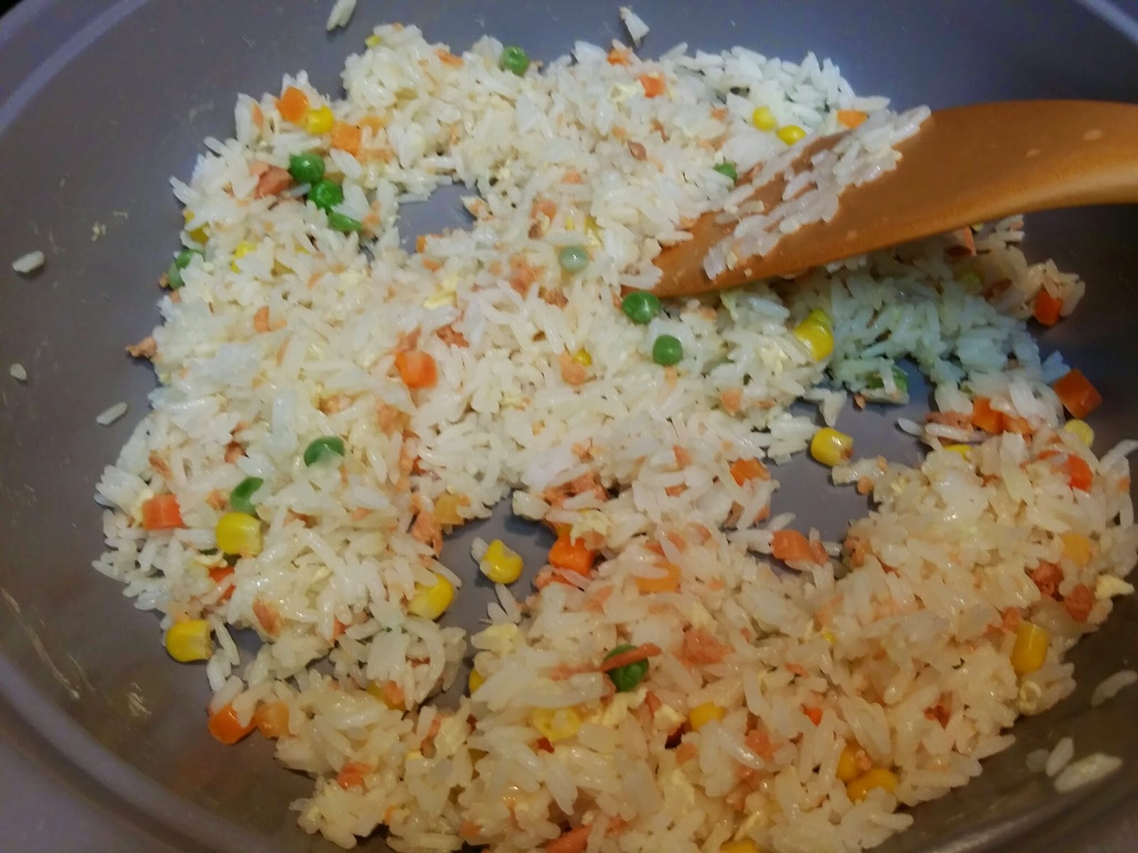 加入鮭魚碎及什菜炒匀,加鹽及白胡椒粉調味盛起