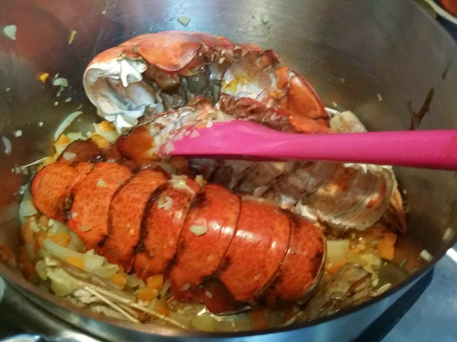 3. 盛起切大粒, 原pan 爆香乾蔥蓉及蒜蓉, 拌入意粉, 再加上龍蝦湯 (續少加入湯底), 最後加入龍蝦粒及百里香, 海鹽調味即可