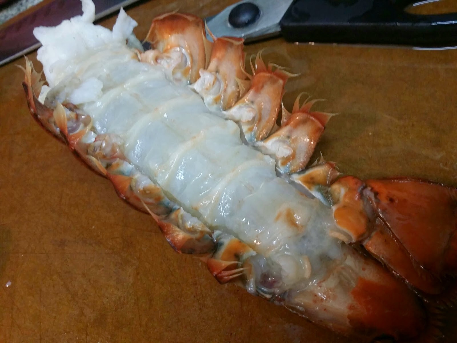 4. 在底部剪開兩邊, 輕輕的把肉原條拉起就可以了 (龍蝦殼留用)