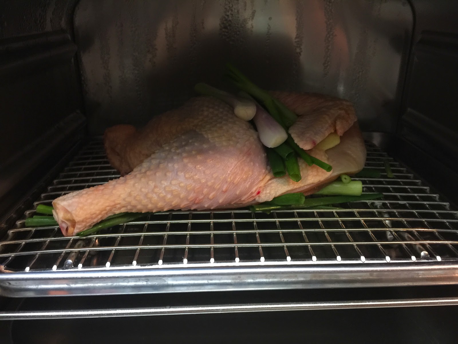 新鮮雞半隻 *洗好用粗鹽擦一下身沖走再用一荼匙粗鹽、一茶匙玫瑰露酒醃半天
