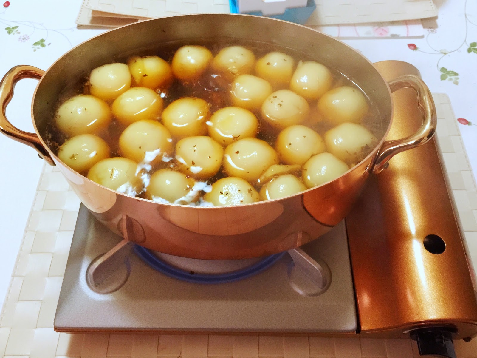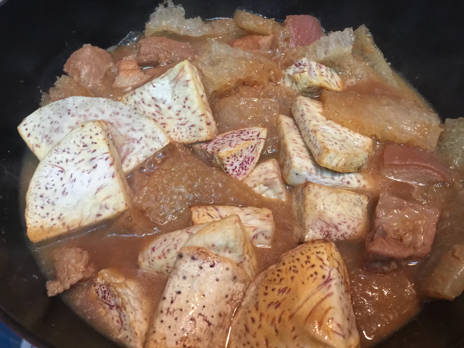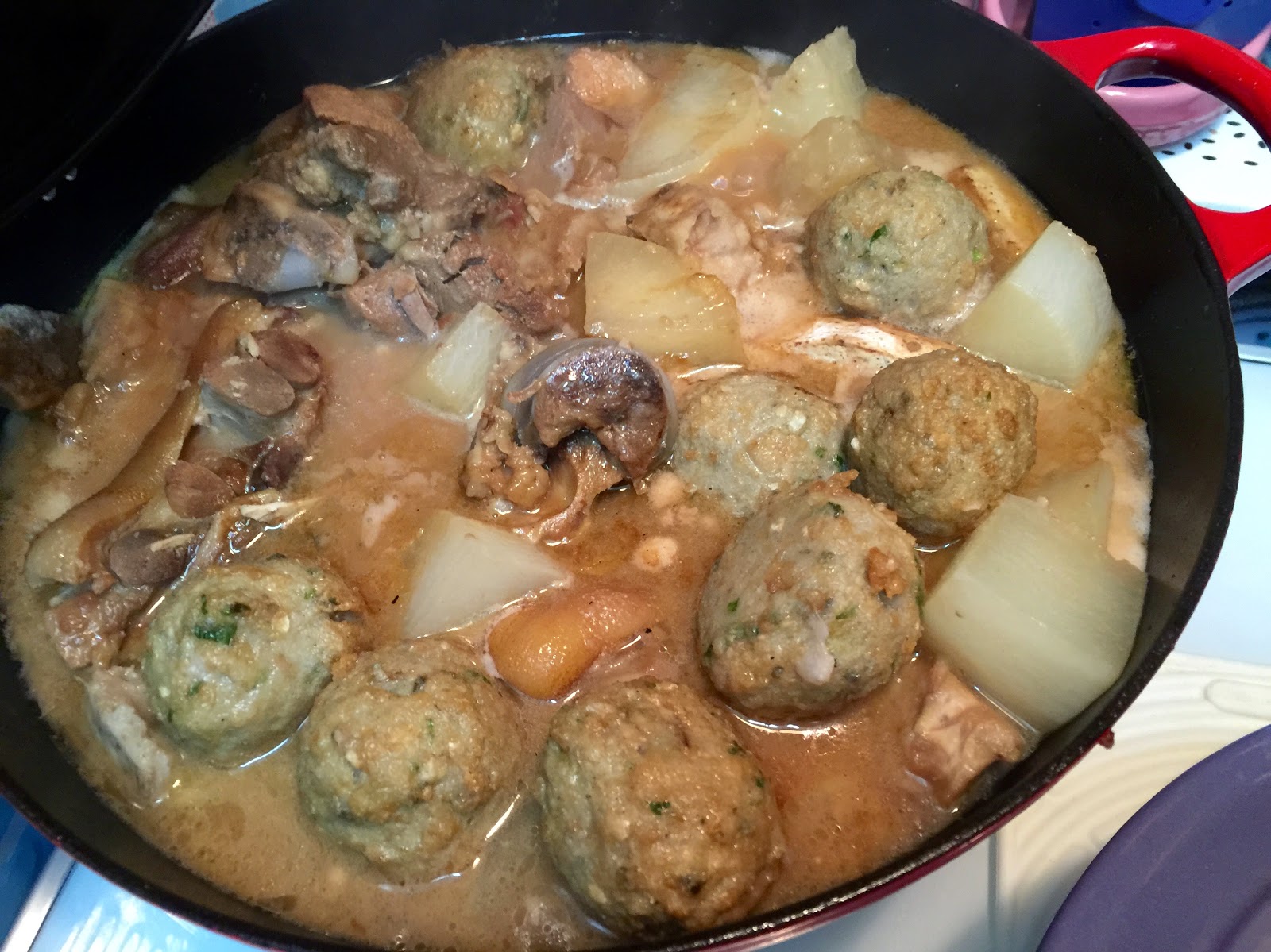 加入炆好的豬手、炸鯪魚球、蘿蔔, 土尤