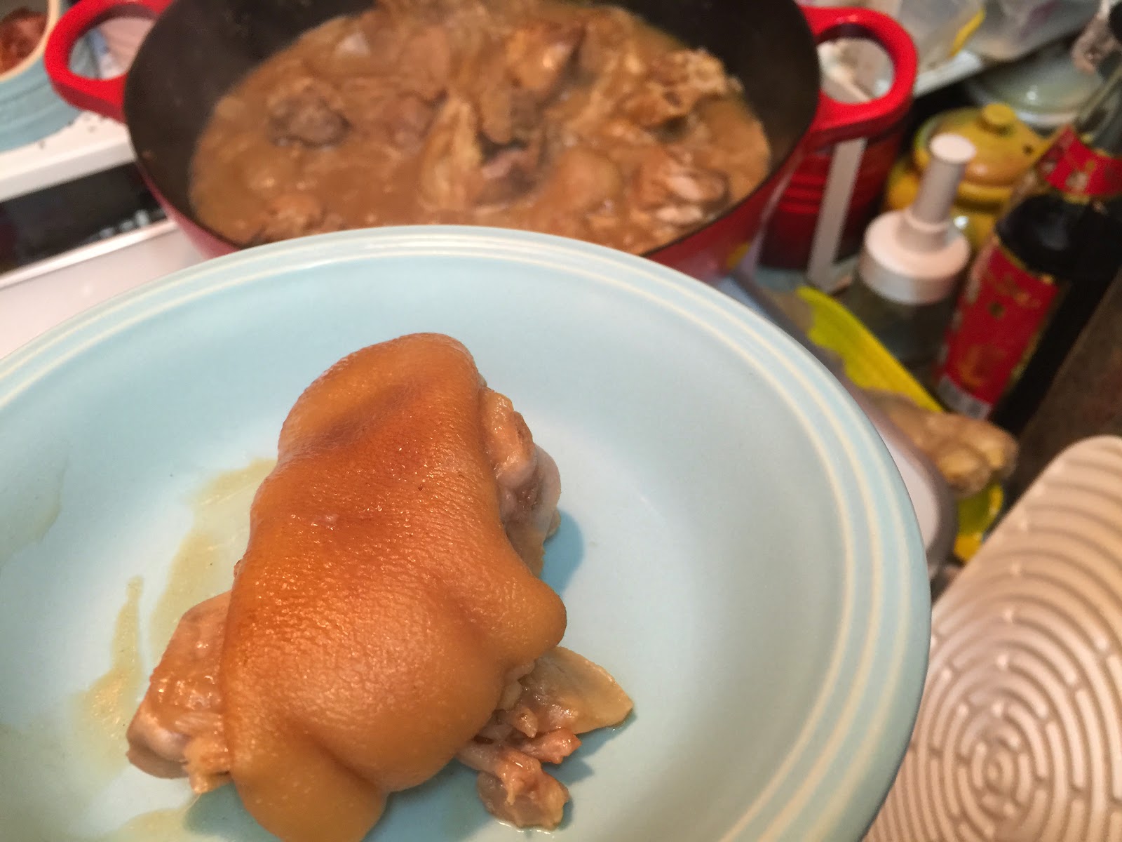 豬手出水, 開WOK爆香薑片、乾蔥及南乳, 下豬手炒一會贊少許, 加水蓋過豬手, 炆45分鐘就夠了。*** 用Le Creuset 就可以用餘溫繼續燜炆至放涼