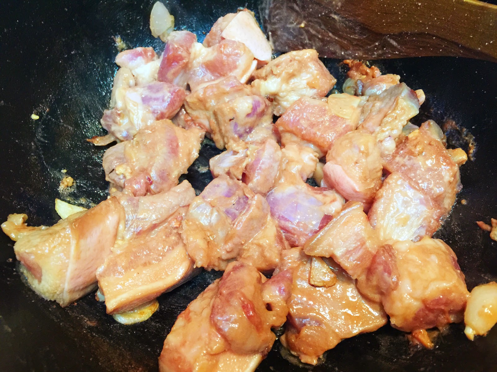 豬腩肉半斤 - 切麻雀般方粒 *少許鹽及老抽醃半小時