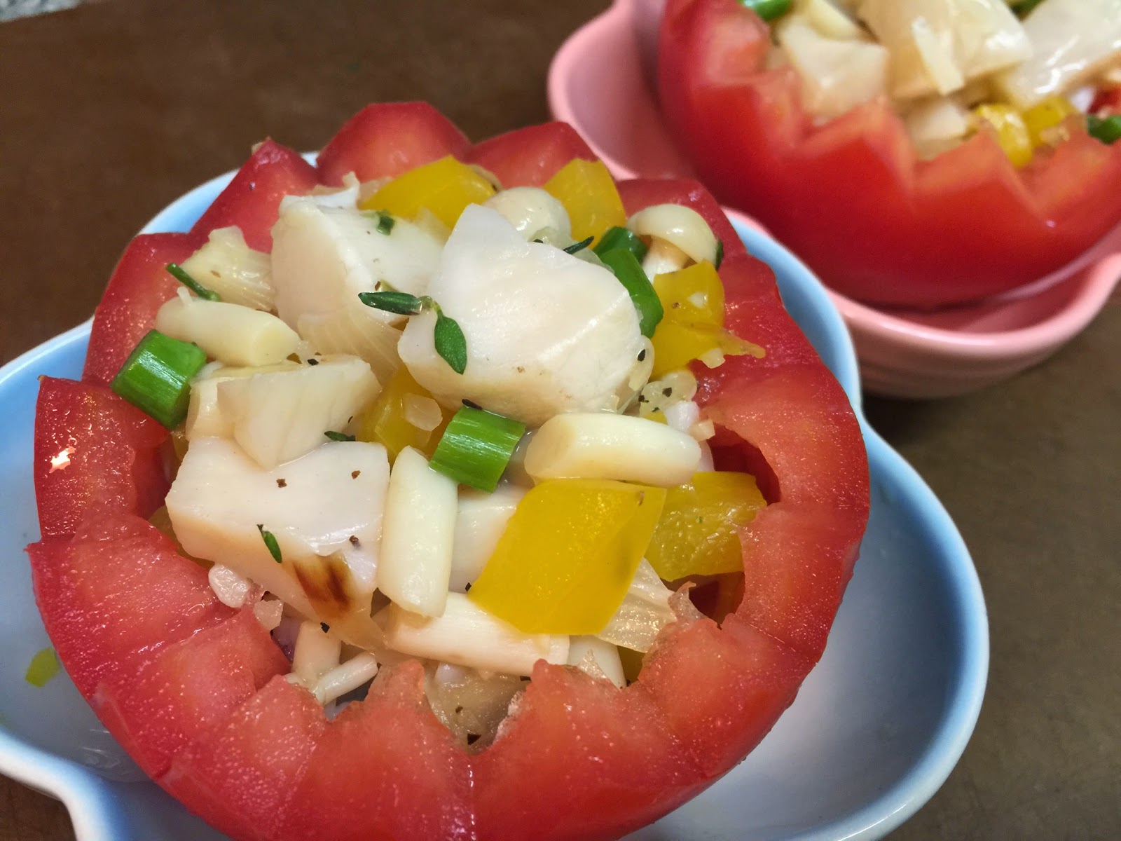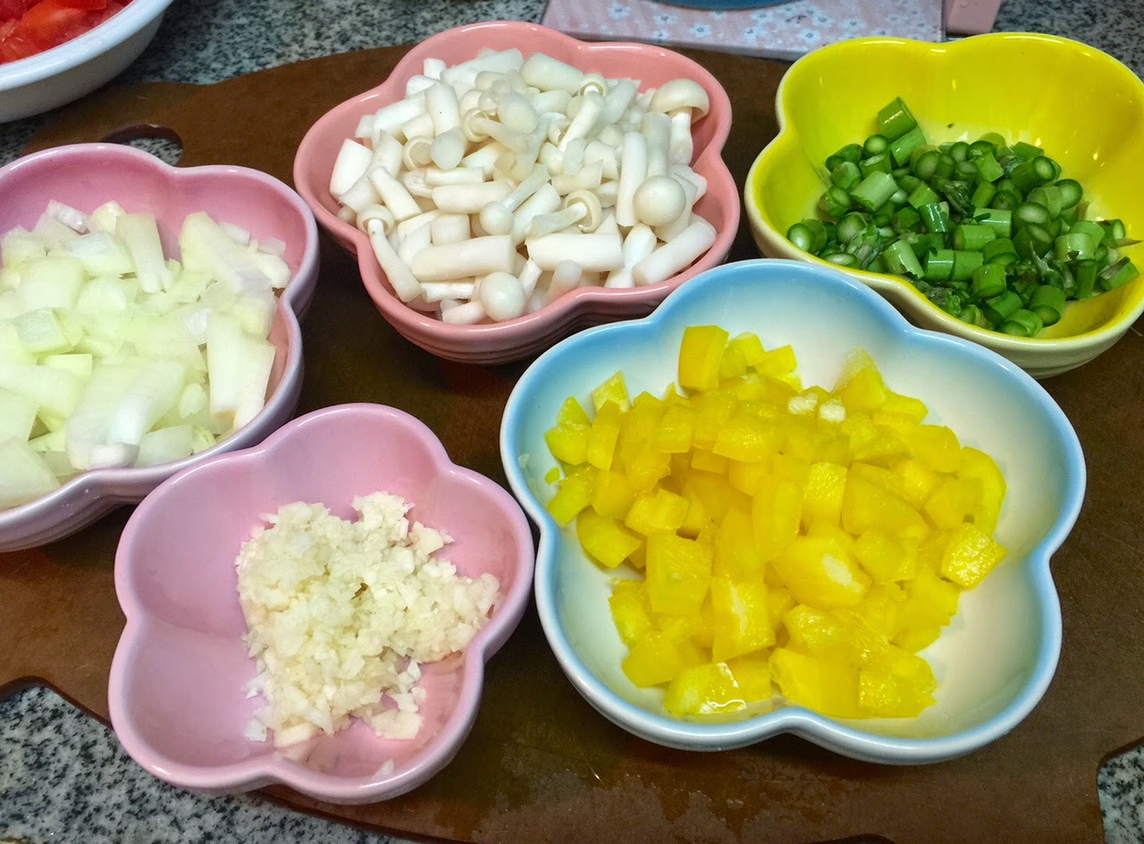 材料好隨意, 我的都是做菜是淨下的物資, 所以足夠兩個盒子有多, 帶子也可以改為蝦仁、蜆肉、蟹肉等....當然, 大大的蕃茄最重要, 新鮮, 圓, 有光澤。