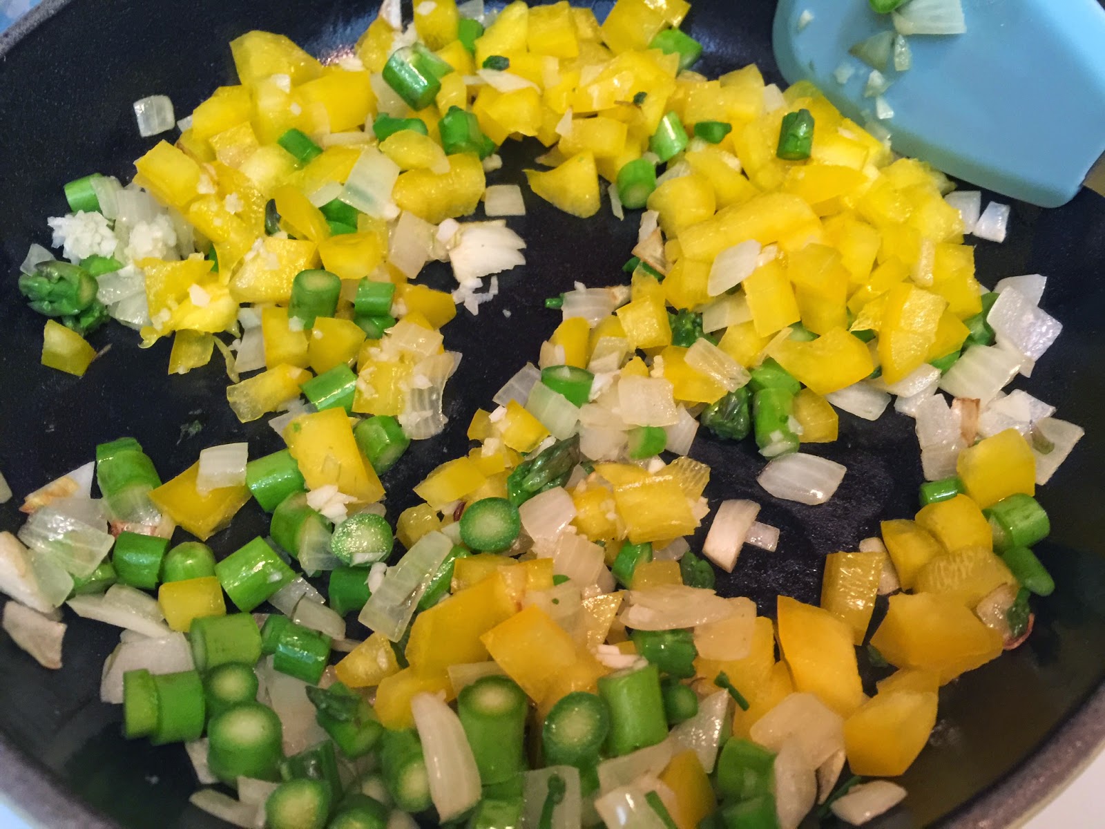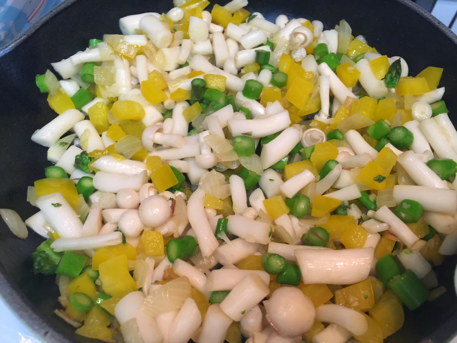 加入蒜蓉、黃椒粒、露筍粒炒2分鐘