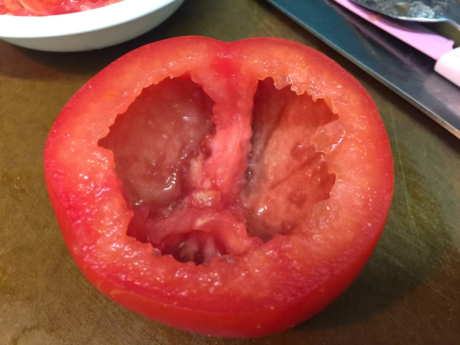 用小刀和匙把蕃茄中的茄肉及籽起出來 (保留用作做意粉)
