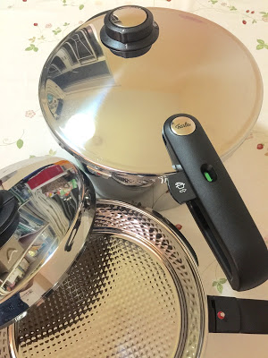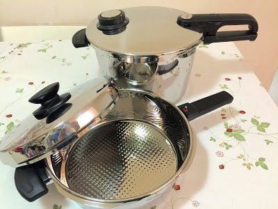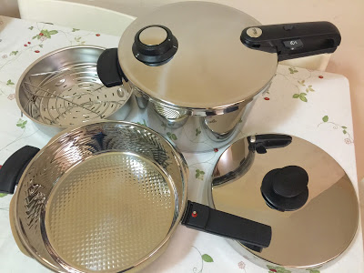 在群組的JMS都有很多寶貴意見, 經過一輪試用(煮友送上門), 又真是慳了不少時間及能源, 就開始在AMAZON找找, 訪問了用家(由於本身是LE CREUSET 鑄鐵鍋盲粉, 所以對壓力鍋不太了解的) 德國制的FISSLER, 一聽我先是信心大增, 無論足球隊、旅行箱、MIELE.....都是十足十的德國制品, 經理解後, 加熱-->加壓-->排氣, 就完成整個過程。