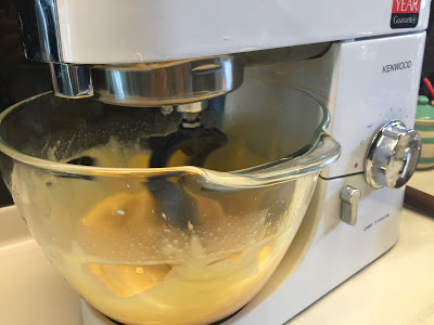 蛋白先用快速, KENWOOD KM 我開至6度, 見有一些泡沫就可以加入砂糖(分3次加入, 途中不用停機),打成有小勾的蛋白霜