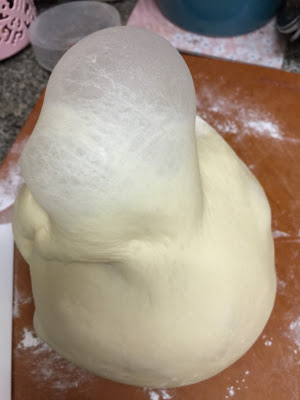 加入牛油扭向min 拌勻,扭向4號速,調較時間為4分鐘,麵糰打至離盤及表面光滑,拉出薄膜即可,蓋好發酵布,發酵至二倍大