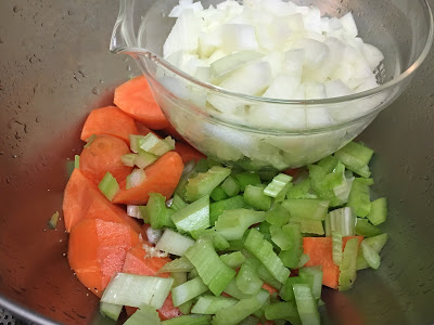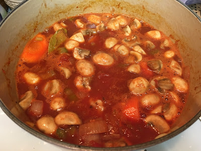 - 加入蘑菇粒、甘筍粒、西芹粒及去皮蕃茄煮滾