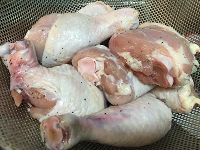 - 雞腿洗淨抺乾水份加海鹽及黑胡椒調味半小時