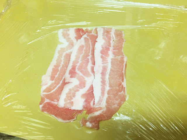 1. 3片豚肉一組,摺疊平舖,放1片火腿