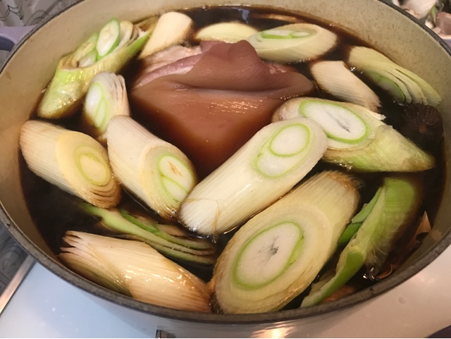 2. 取一個可入焗爐的鍋子, 加入所有烹調醬汁及咸豬手, 中火煮至滾起關火