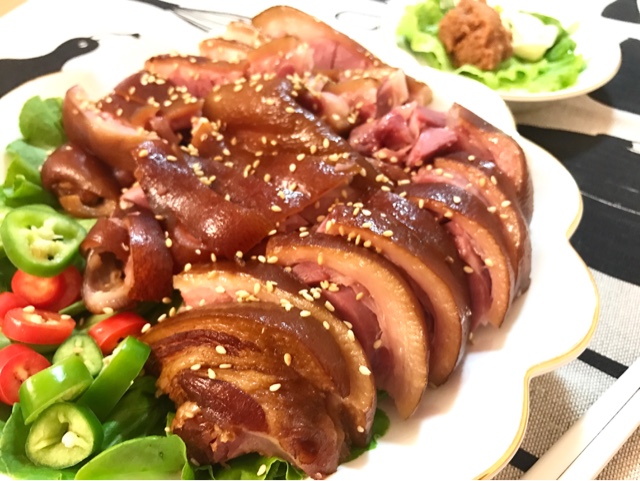 6. 時間完成即可取出豬手, 放涼 15 分鐘, 去骨切件, 灑上芝麻配以生菜、蒜片