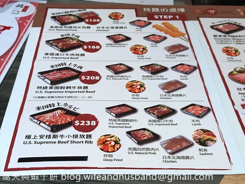 稻八點餐第一步是選擇放題套餐,窩夫與蝦子餅選了極上安格斯牛小排放題(每位$238),可任食來自美國的安格斯牛小排、美國自然豚肉片、日本北海道雞片、羊肉、炸物和刺身。