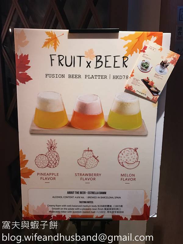 窩夫終於有機會一試Espuma,星期日跟蝦子餅去提早慶祝結婚三週年紀念。 在餐廳的入口看到這張海報,賣相非常吸引的水果啤酒拼盤,可惜窩夫與蝦子餅都不喝酒。 窩夫與蝦子餅被安排坐在靠窗的位置,感覺開揚。 窩夫很喜歡這個餐牌封面,食物看來特別吸引。 點了價值468元的二人套餐。 先來精選小食拼盤,共有三款小食,分別是西班牙黑毛豬火腿、焦糖單骨雞翼和西班牙黑毛豬火腿薯蓉。廚師細心地用西班牙黑毛豬火腿卷著火箭菜,再... 看全文 -