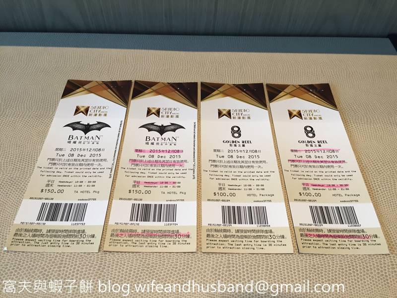 11月中見到澳門大激賞震撼優惠,價錢實在非常吸引,入住新酒店新濠影匯一晚,連金光飛航來回船票(每套約300元)、影匯之星門票(每張100元)及蝙蝠俠夜神飛馳門票(每張150元),二人合共不用1500元,便跟蝦子餅來一個澳門兩日一夜之旅。 上午9時由上環港澳碼頭出發,約10時左右到達澳門氹仔碼頭,完成入境手續後,先取一些旅遊資料,然後便找新濠影匯的免費穿梭巴士,登車前收到小禮物,一人一個行李牌。 下車後,沿著指示往明星匯辦理入住手續,沒想到還未到11時已經可... 看全文 -