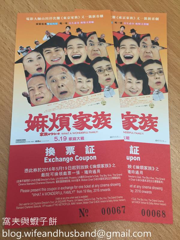 繼《我來自紐約》後,媽媽說想看《嫲煩家族》,窩夫又去參加網上的抽獎,幸運地抽到了由Marie Claire HK送出的《嫲煩家族》電影換票證兩張。 《嫲煩家族》是日本電影大師山田洋次繼《東京家族》後的最新溫情喜劇,有機會的話窩夫也要看看《東京家族》。 劇情:平田先生與平田太太這對老夫老妻有三名子女,長子幸之助與他的妻子一直與父母同住;長女成子與她的丈夫泰藏也是他們的鄰居;次子庄太則準備迎娶當護士的憲子。在平田太太生日當天,平田先生問她想要甚麼生日禮物,她的... 看全文 -