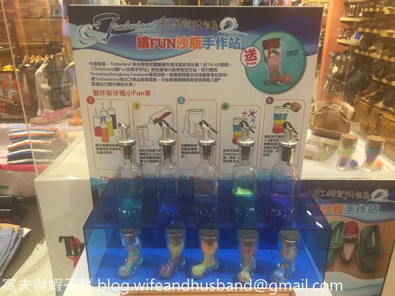 早前參加了《Timberland繽Fun沙瓶手作站 - 送你創作海洋彩色沙瓶手體驗》Facebook遊戲,可於指定日期及Timberland分店免費獲贈精美靴型玻璃瓶一個。 可以帶最多三位朋友一齊即場製作海洋彩色沙瓶,我當然要跟蝦子餅去啦。 打開抽屜,可以找到小貝殼和其他工具。 左邊是窩夫的作品,右邊則是蝦子餅的傑作。 是次活動宣傳的是全新春夏帆船鞋系列,顏色看來很吸引。   Email:&... 看全文
