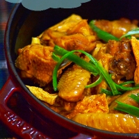 慢火雞翼煎香, 再拌入沙嗲醬兜炒片刻