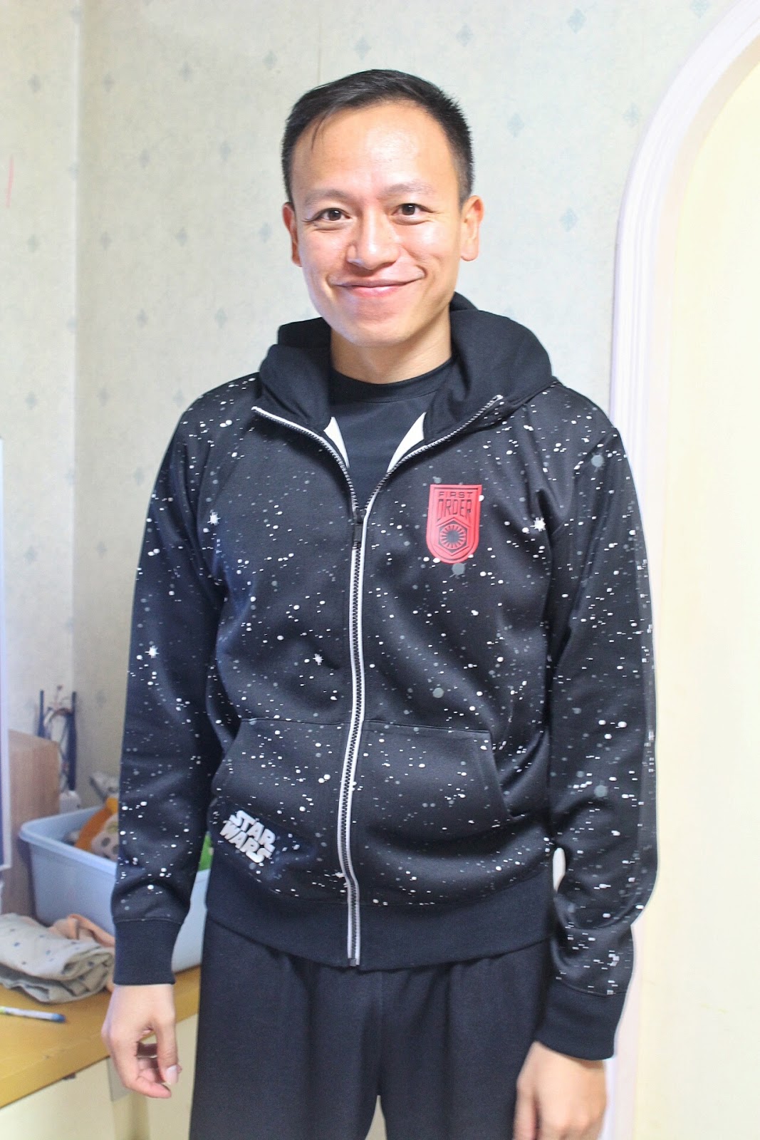 還有一件,近期朋友可能留意到兩口子輪流穿的男裝 Star Wars印花拉鏈外套 ($450),物料輕薄舒適、款式挺身好看,170碼爸爸穿上身較貼身,媽媽穿就較鬆身隨意,各有美態!一件衫兩份穿,好抵啊~