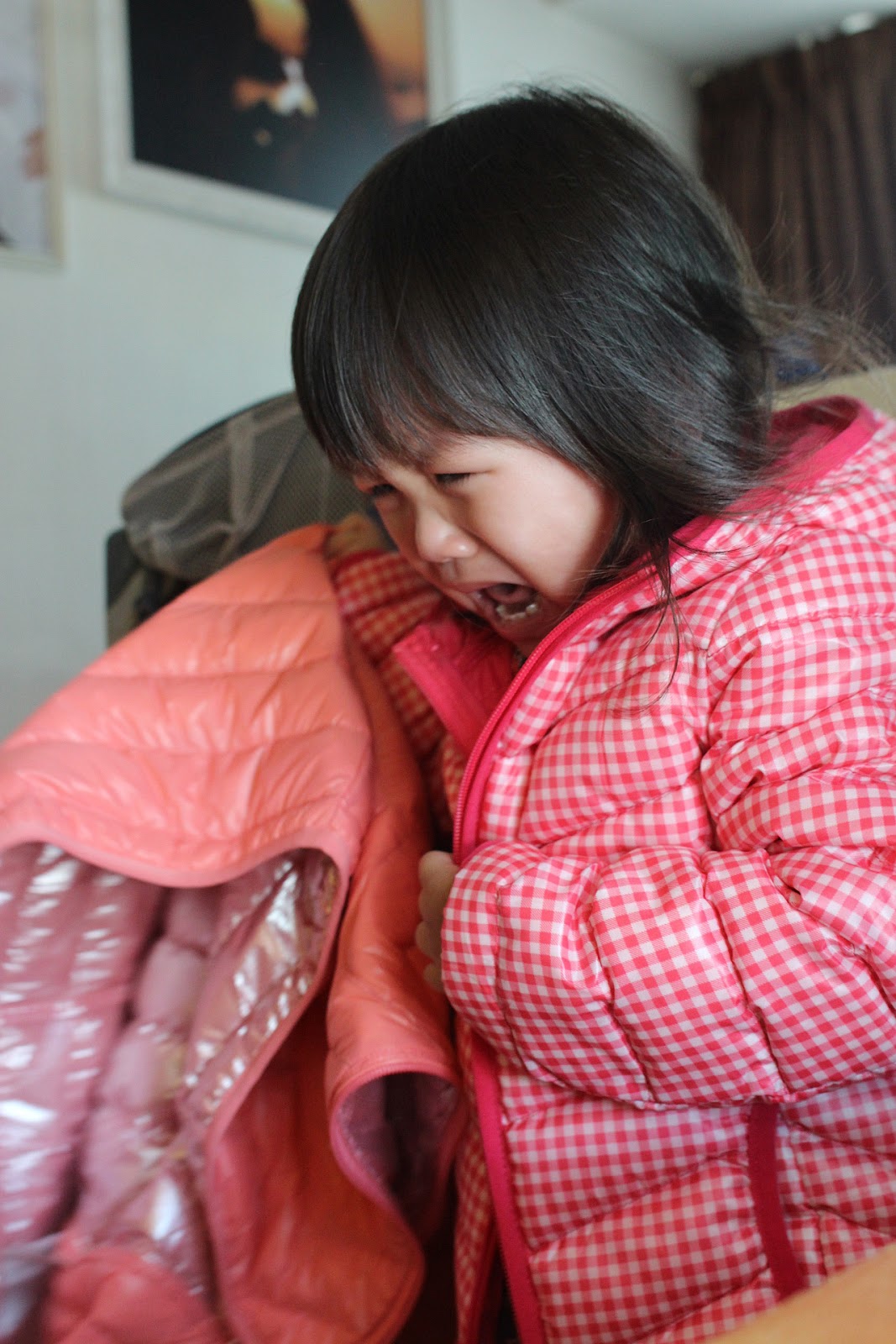 問題來了:週末收拾整理衣服時,給妹妹發現兩件新衣,貪靚的她要穿,好吧,如她所願。但穿上身後,又要求媽媽一起穿;大佬,做完家務身水身汗,不是要羽絨咁大鑊吧?然而妹妹苦苦堅持、又可憐哀求,終於驚動了爸爸來。