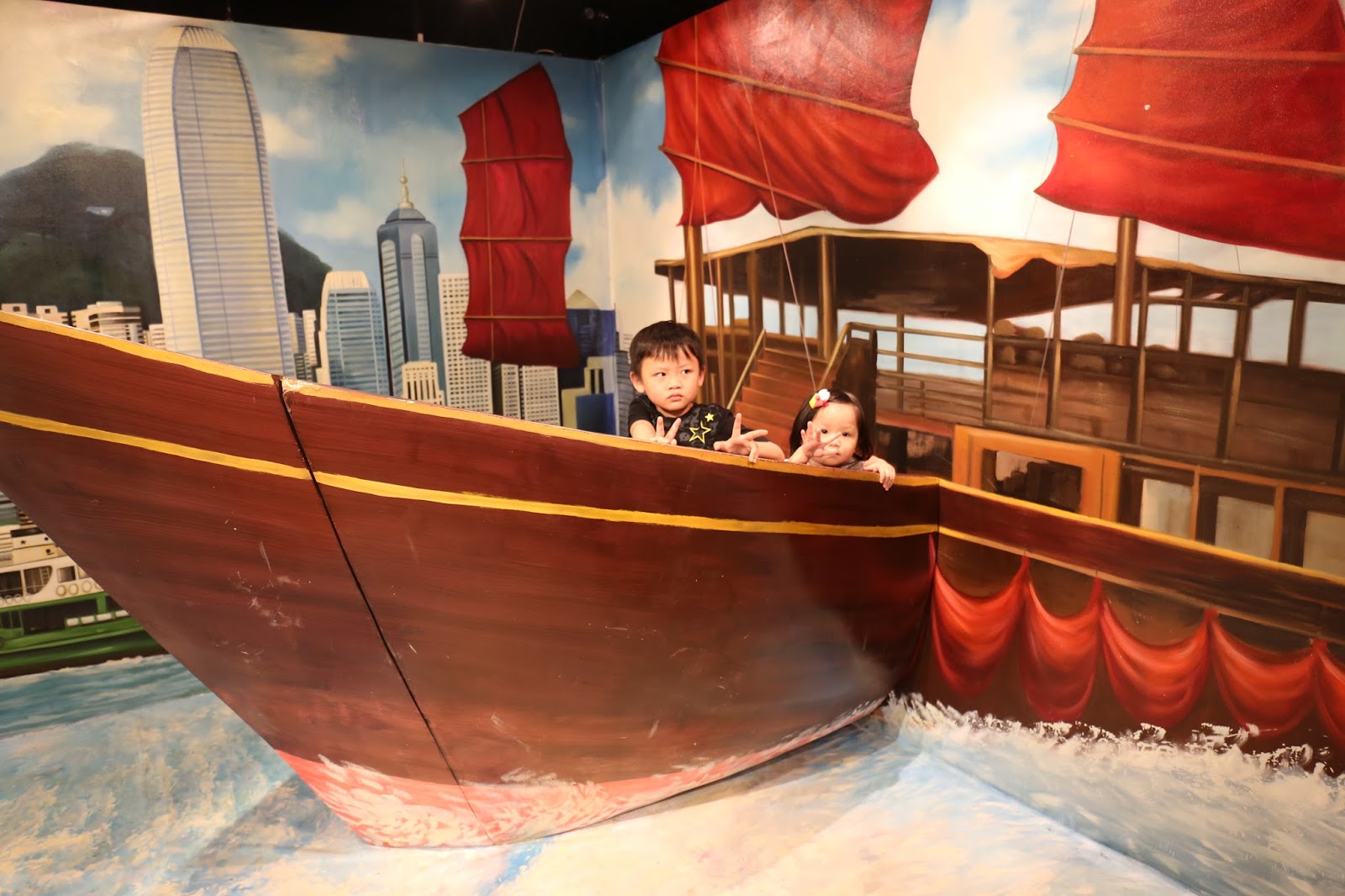 小兄妹,小心別掉下去啊!其實還有利東街、車仔麵檔等港式經典場景。不過兩兄妹耐性已不多了,還是拍完快快離開吧~