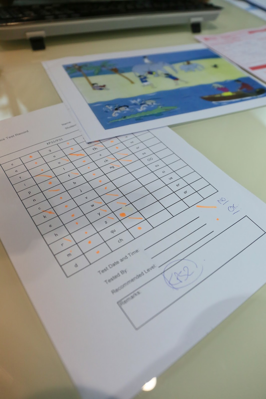 媽媽常在家教生字 (flash cards, talking card, story books 等等),卻沒有正式教過 Phonics,不過可能在幼稚園非正式的學過一些(說是非正式,因為功課未見過),所以Matthew大部分的音標也讀得到,表中點點的 就是OK過關!根據他的表現,如果要入學,可跳過 KPS1,直接就讀 KPS2 的班別了~ 不錯呢!=)