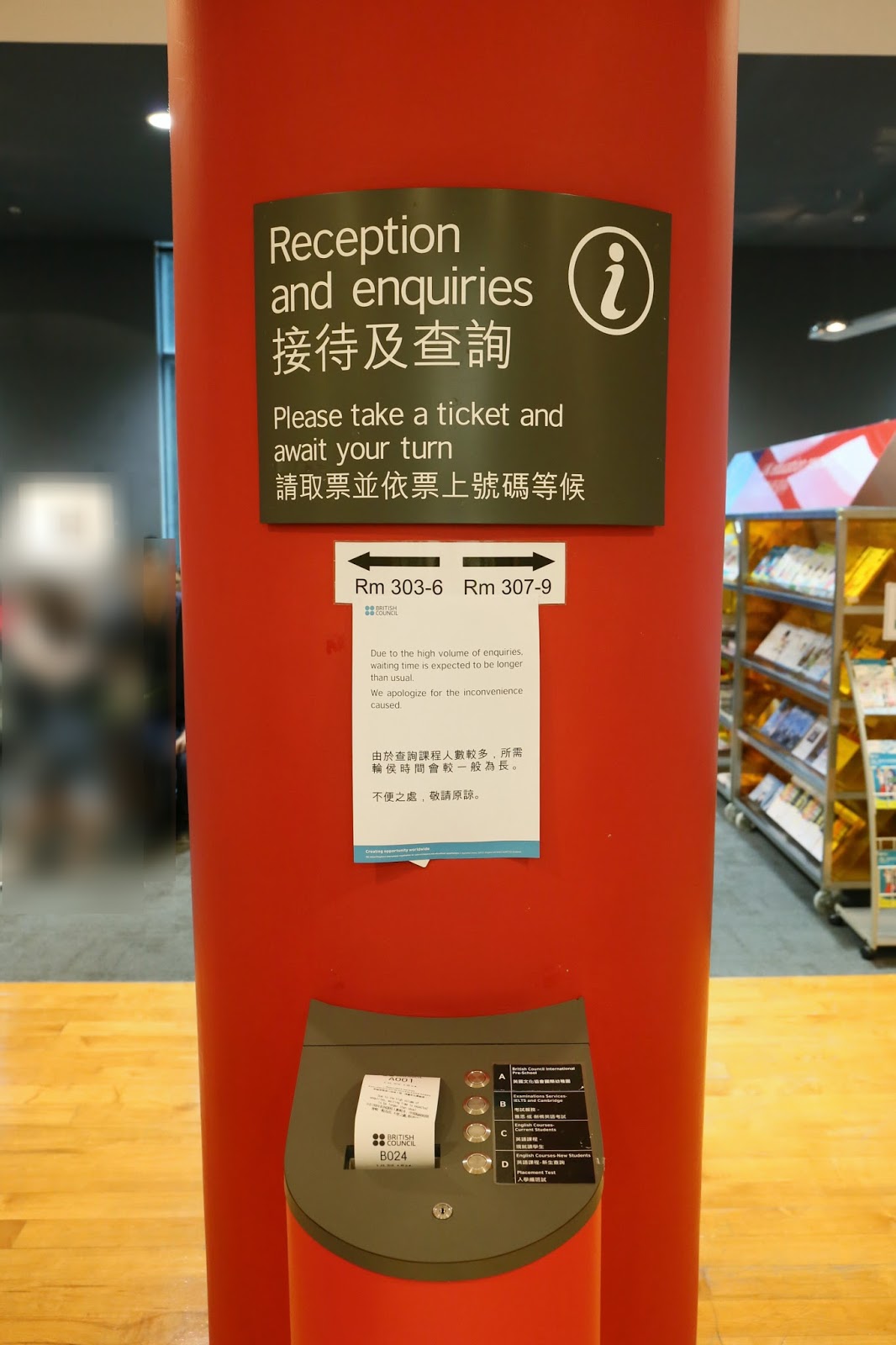 大家到英國文化協會前,可先到三樓接待處,按想查詢的資料先取票 ,由顧客服務人員接待,開放日當日我們可直接等候。這區有不少英國教育資料,由幼兒暑期課程以至成人課程都有單張海報。隨著脫歐後英磅大幅下滑,不少父母都想子女到英國升學,這裡也有一些相關資訊提供的!