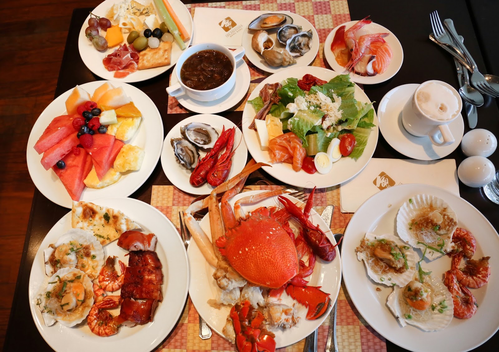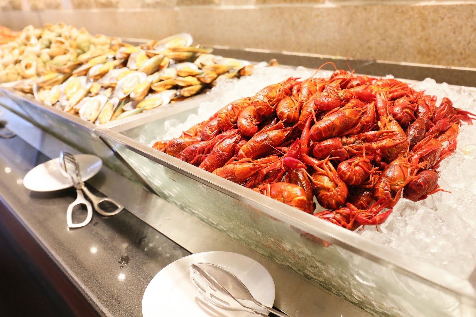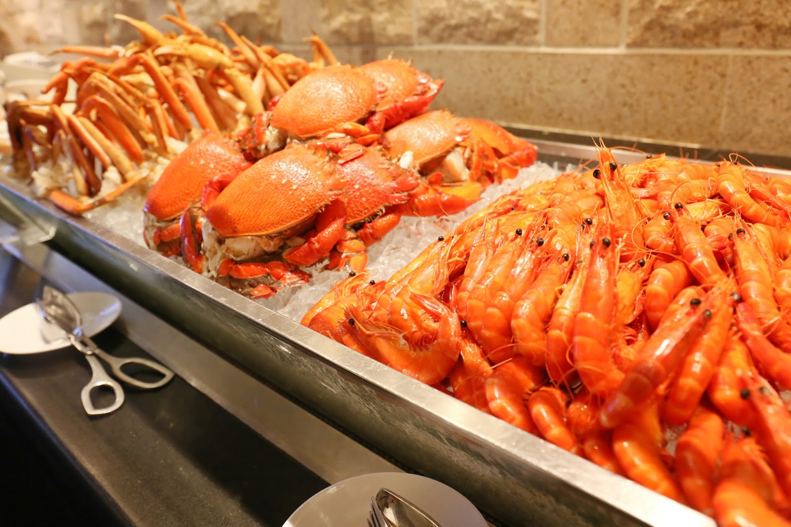 自助晚餐6點就開始了,非常適合喜歡早飯的我們!預早了十分鐘抵達,就坐後馬上拍下食物選擇:繼麵包及兩款湯(其中洋蔥湯十分足料不錯的),就是大家都非常關心的凍海鮮,有加菲蟹、蟹腳、大蝦、龍蝦仔、青口及翡翠螺!大部分質素都很鮮甜不錯吃。