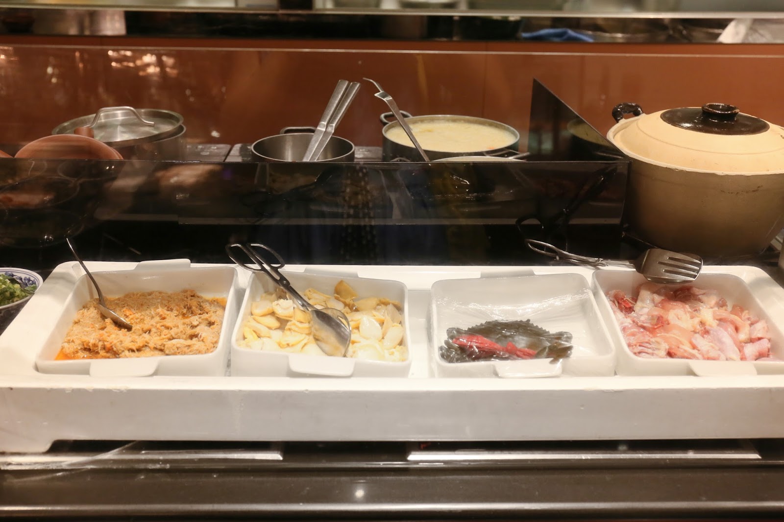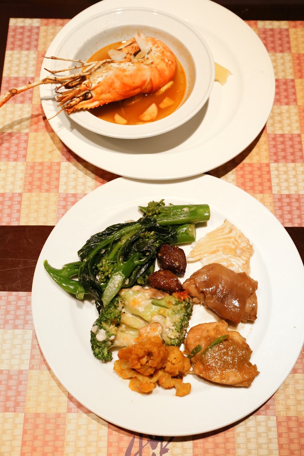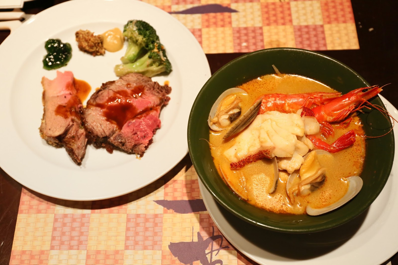 自助晚餐6點就開始了,非常適合喜歡早飯的我們!預早了十分鐘抵達,就坐後馬上拍下食物選擇:繼麵包及兩款湯(其中洋蔥湯十分足料不錯的),就是大家都非常關心的凍海鮮,有加菲蟹、蟹腳、大蝦、龍蝦仔、青口及翡翠螺!大部分質素都很鮮甜不錯吃。