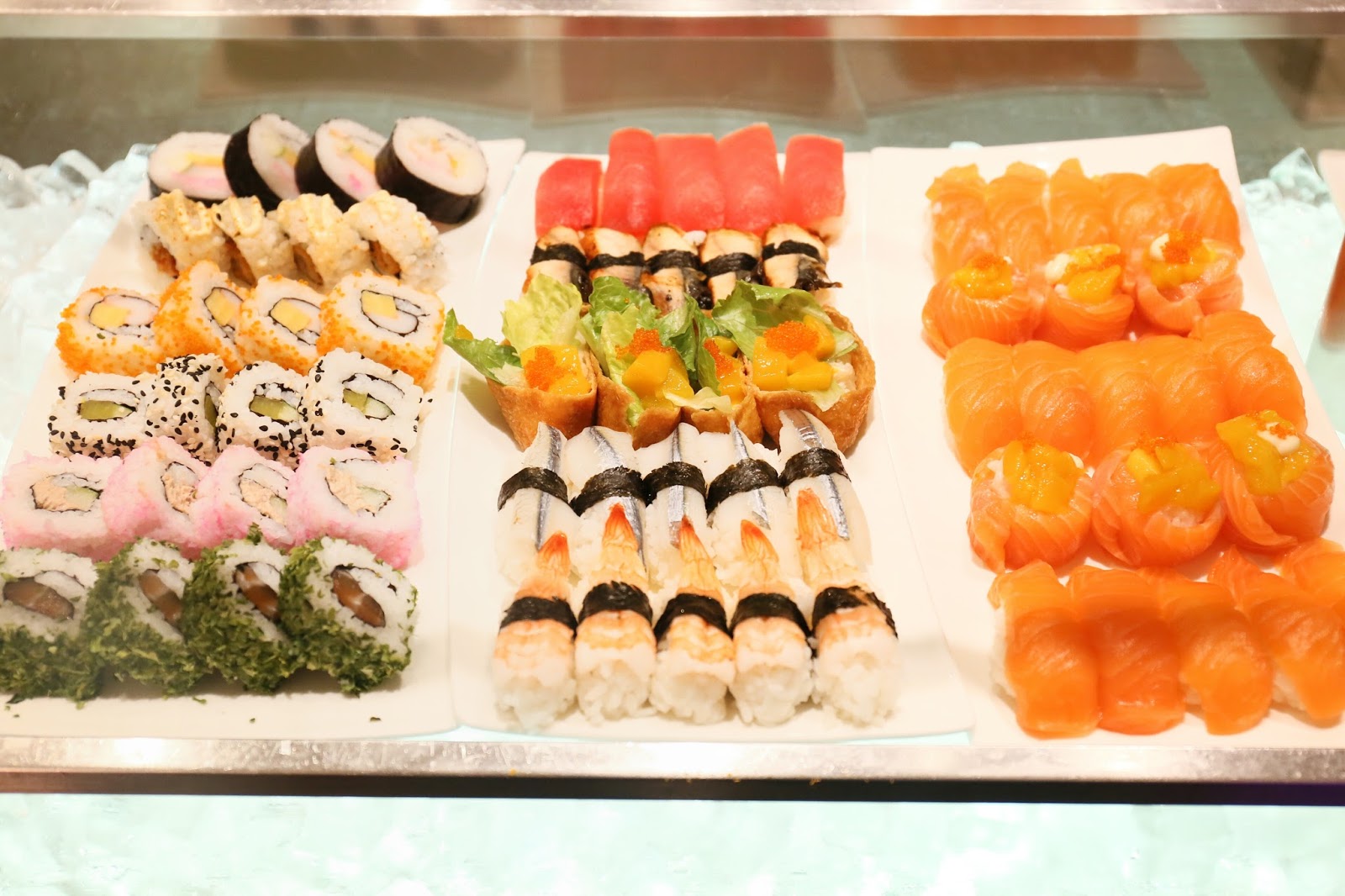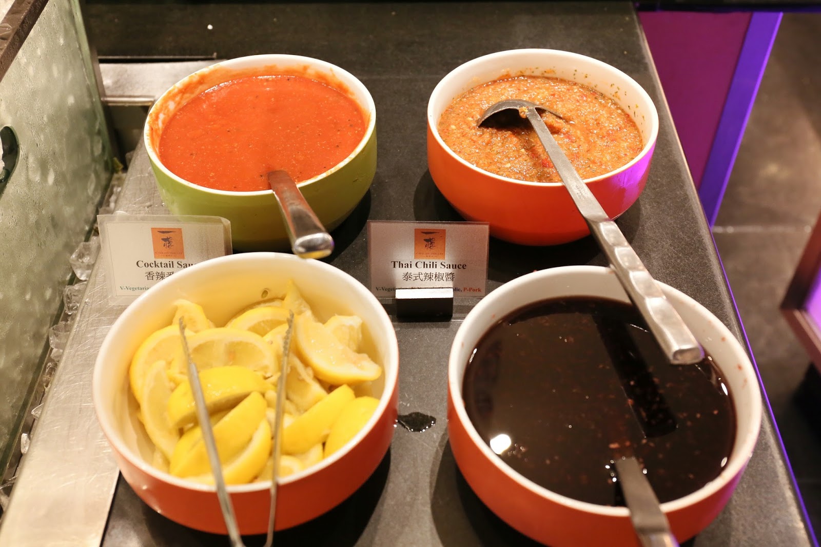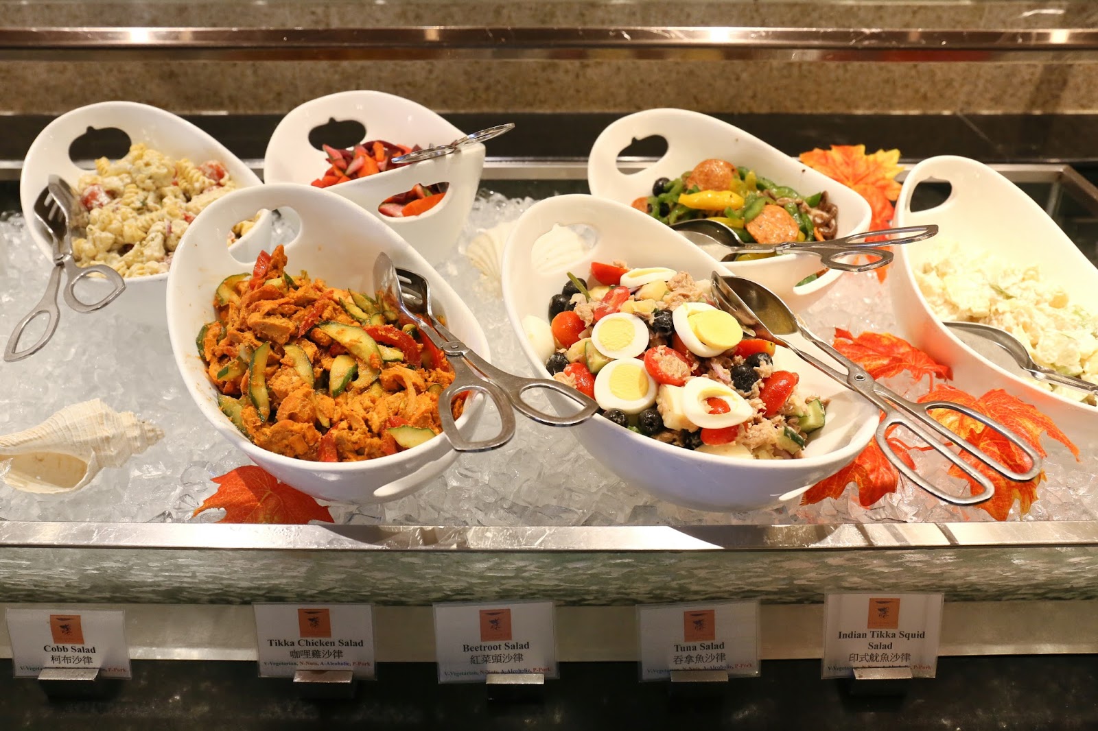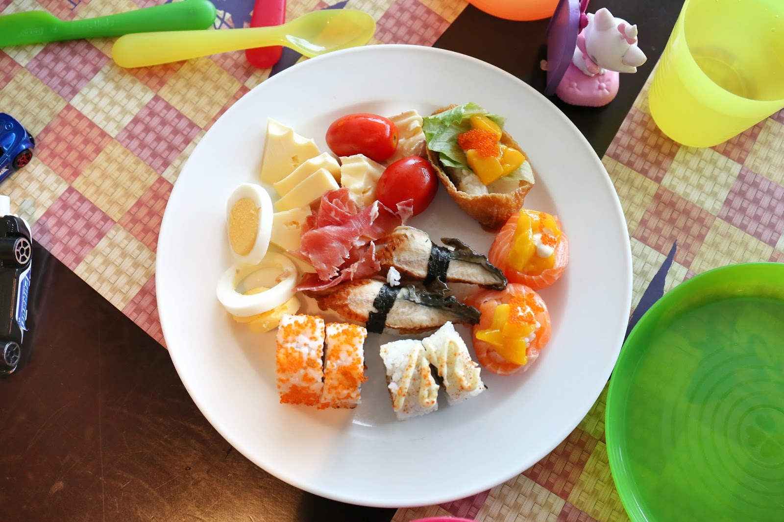 座位方面,這晚對著海景用餐,感覺很寫意舒服。趕快給小兄妹取了最愛的壽司、芝士、火腿等等(父母一定要先照顧小孩,所以6點開始時間最好),就輪到兩口子的頭盤了!
