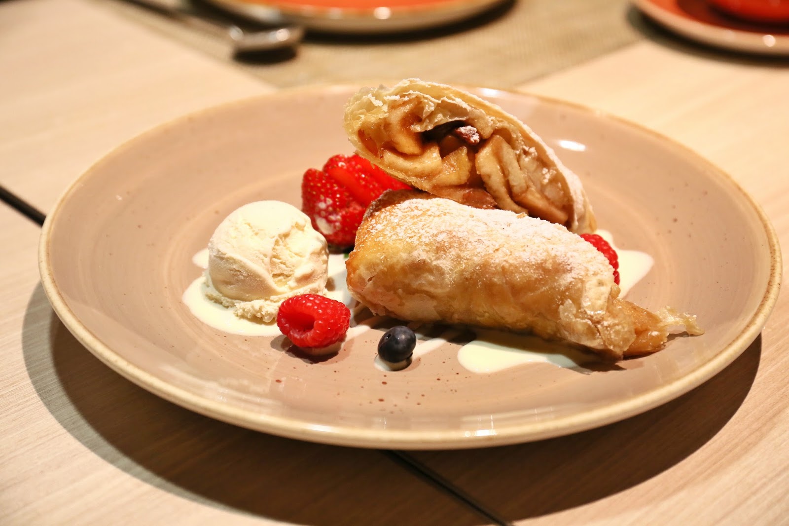 去到甜品環節,有兩款選擇,先是 Baked apple strudel with vanilla gelato 焗蘋果卷配雲呢嗱雪糕,成品簡單得來香甜酥香好吃,而且份量不少,不說還以為是二人份甜品!