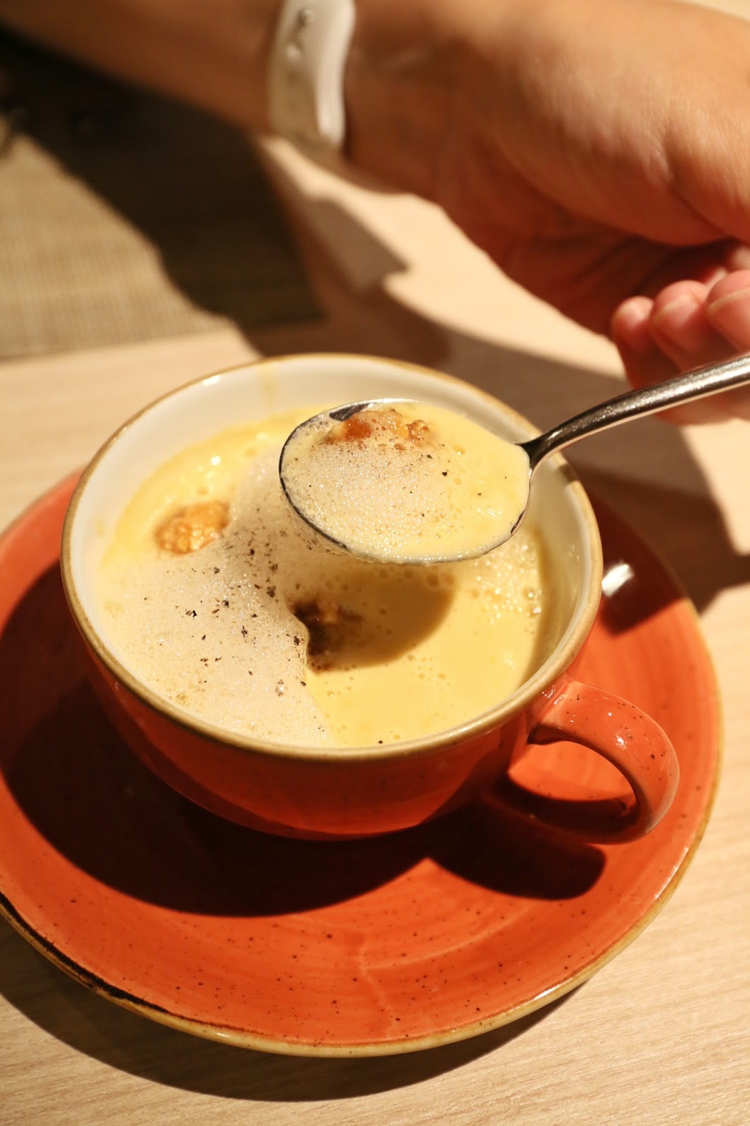 頭盤另一選擇是 Sweet corn bisque served with crispy popcorn玉米濃湯配脆爆谷,湯的份量不算多,但內容更加精緻:除了湯身粟米味濃香甜,加上香脆爆谷及柔和泡沫,也令口感更豐富又繽紛。