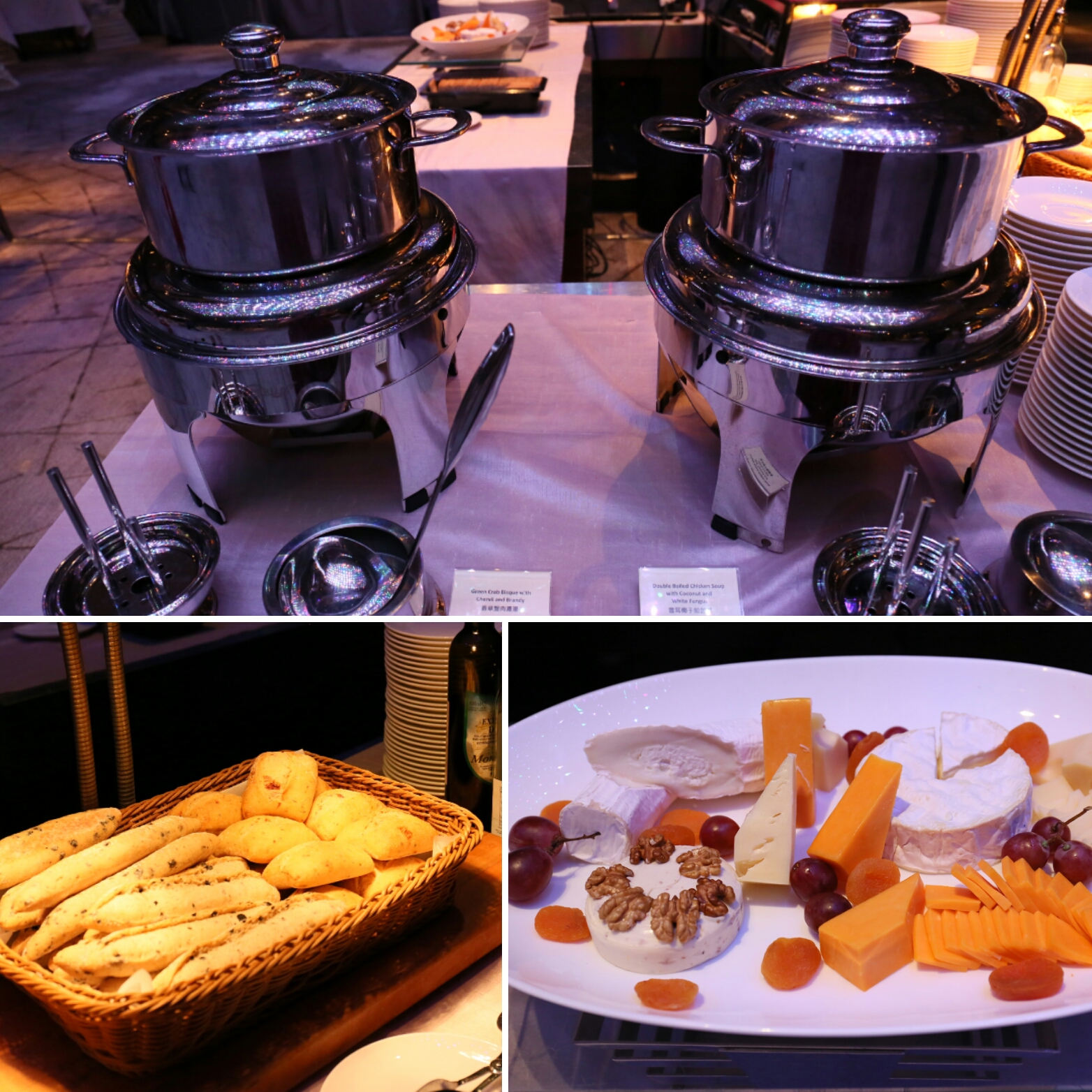 場內有一中一西湯水,分別是香草蟹肉濃湯,以及非常足料的雪耳椰子煲雞湯;場內亦有不同款式的麵包,以及多種口味的芝士併盤可供選擇。