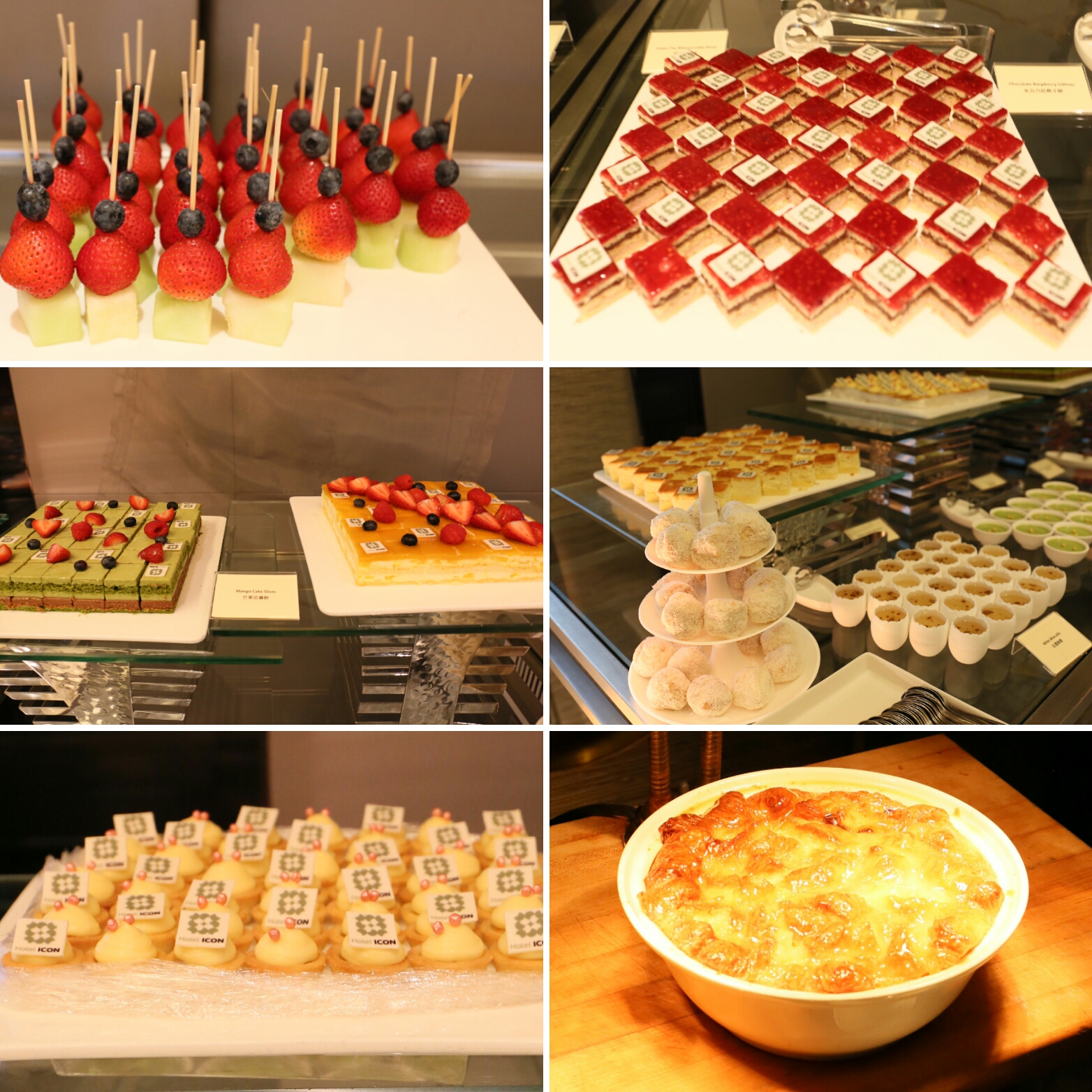 最後甜品款式也不少:生果串、紅莓千層蛋糕、綠茶千層蛋糕、榴槤芝士蛋糕、檸檬撻、白酒啫哩杯、綠茶慕絲、朱古力泡芙、麵包布甸,還有忘拍的更多果撻、水果盤及榴槤雪糕!